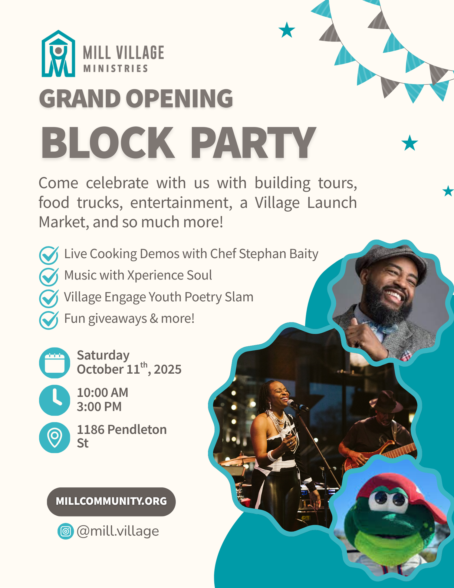 Join us for a festive eighth day of our Holiday Market featuring Village Launch Vendor Highlights at Mill Village Ministries. 1186 Pendleton Street courtyard. We will have Live Music to add to the Christmas magic!